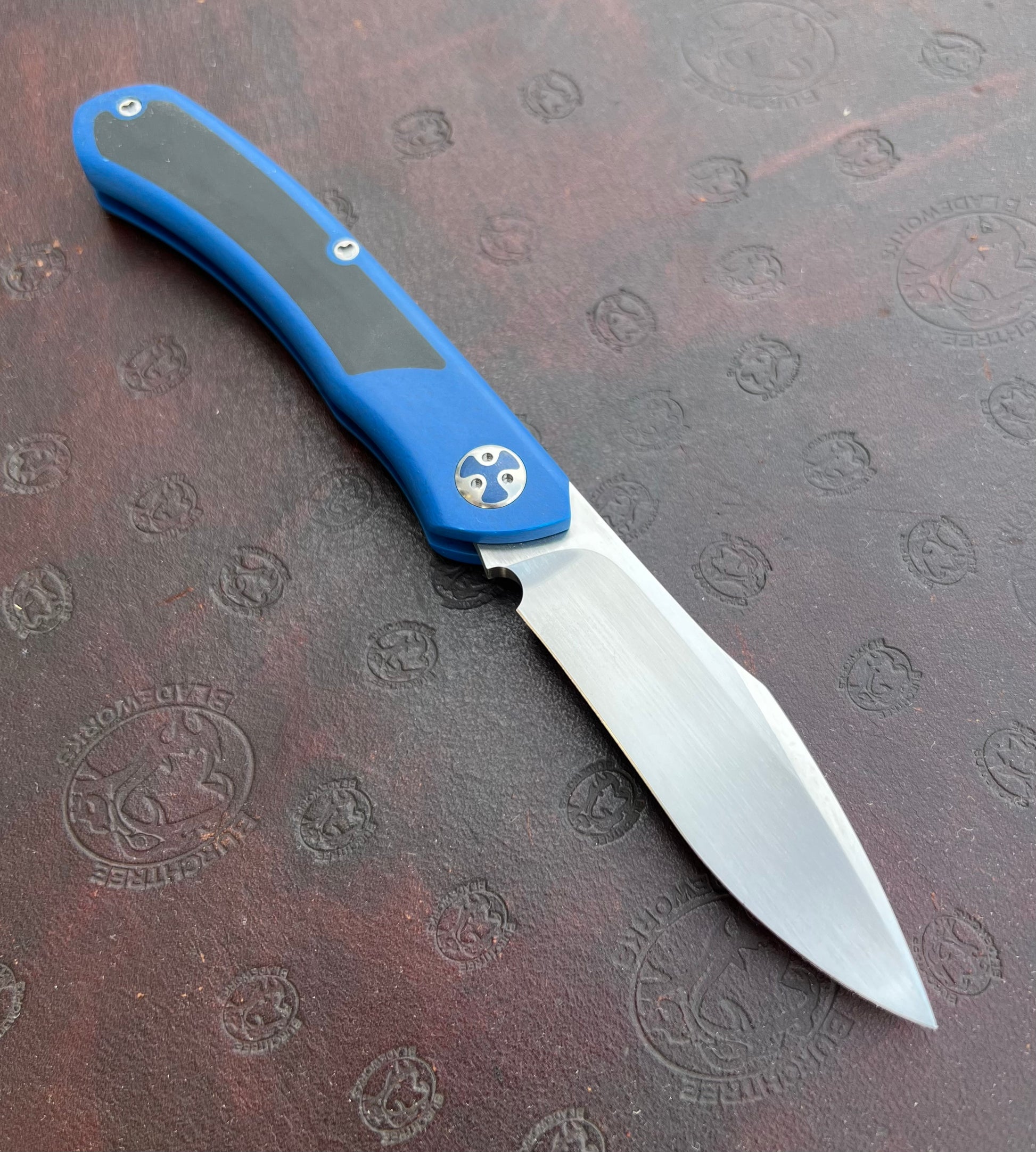 New blue glass micarta handle with black Richlite inlays. Titanium pivots feature blue glass inlays and the body screws also made in-house. CPM-154 blade and backspring.