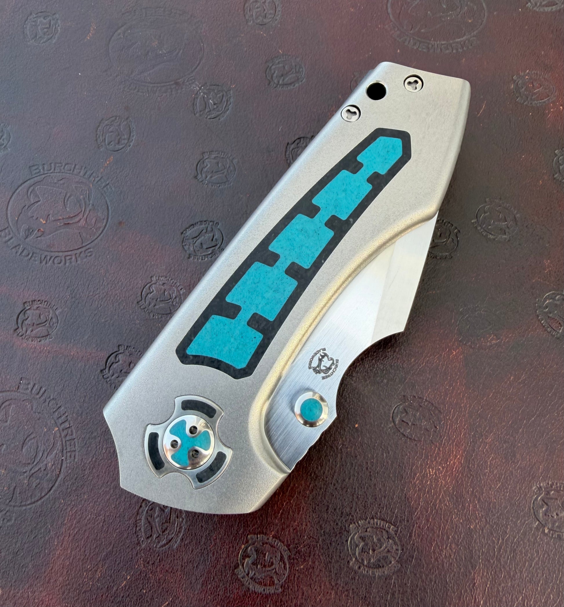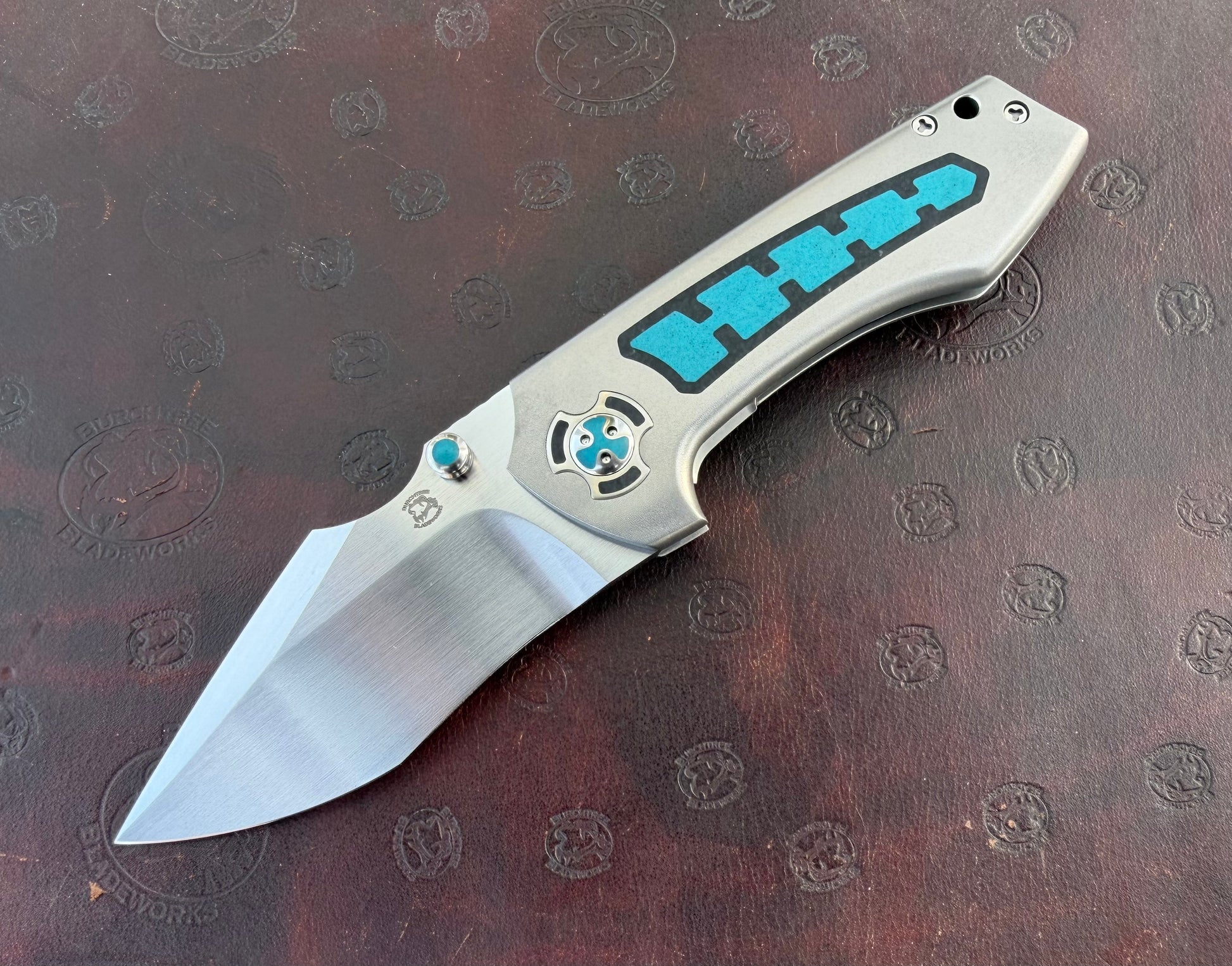 Inset lock Boson with modern glass composite inlays. It has a 3-inch blade of CPM-154 with inlaid thumb studs. The handle has cyan-blue/green glass composite inside black glass composite. Homemade body screws and pivots that are also inlaid.