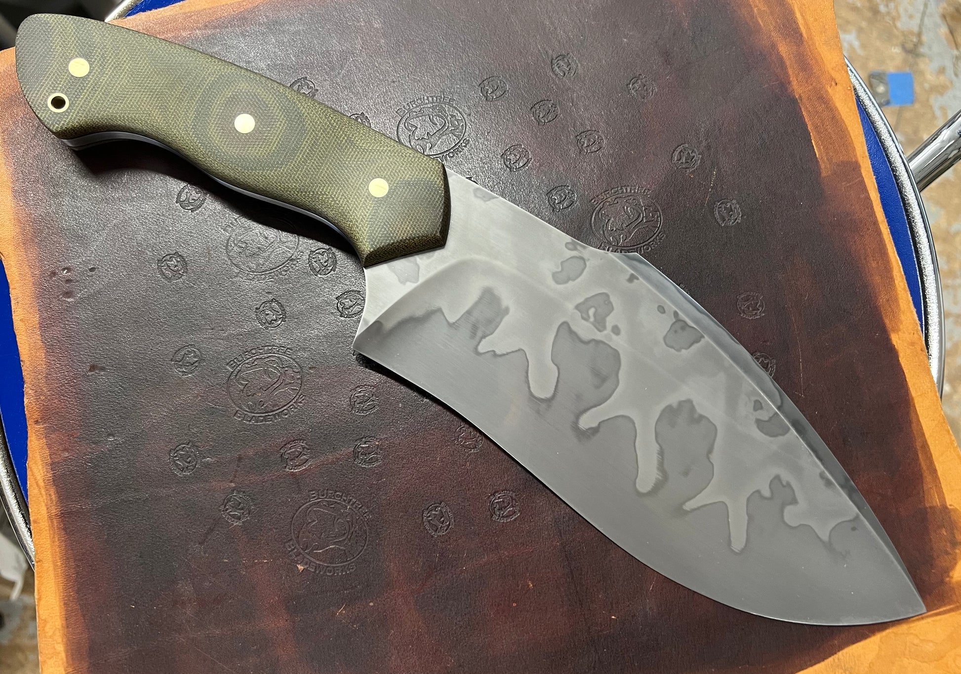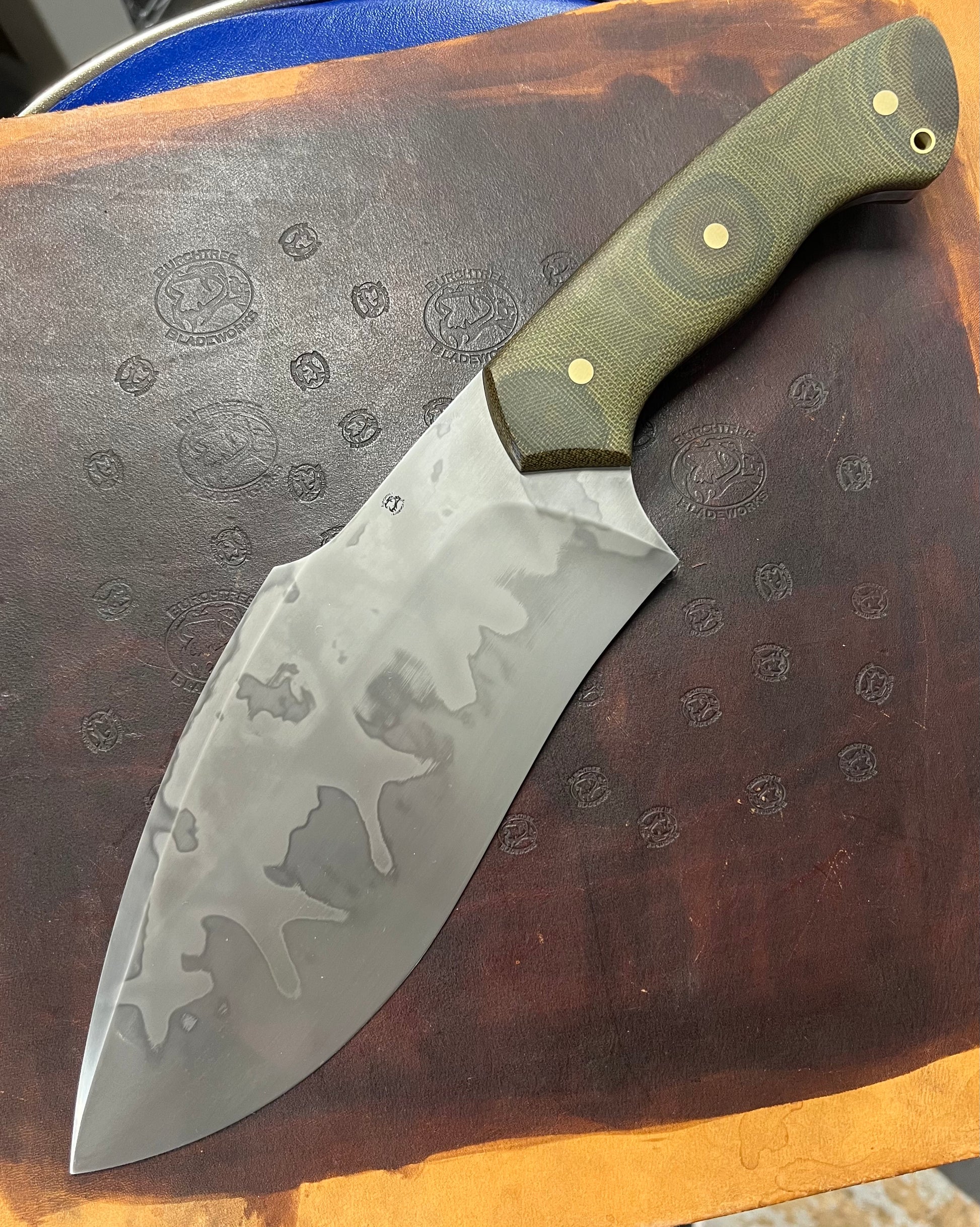 This one features about an 8-inch blade out of .250-thick W-2. It is 14-inches overall and is 3.25-inches at its widest. The handle is heavily-contoured green canvas Micarta with black G-10 liners and brass fittings. No sheath with this one.